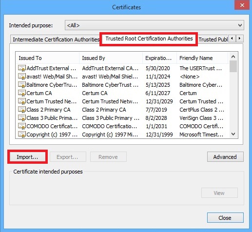 در کادر باز شده روی تب Trusted Root Certification Authorities  کلیک نمایید. سپس در پایین کادر روی گزینه Import  کلیک نمایید.