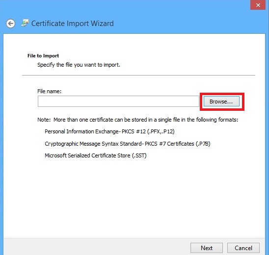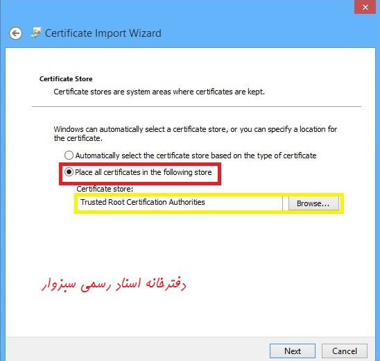و در کادر بعدی گزینه Place all certificate in the following store کلیک نموده و آنرا انتخاب نمایید. سپس روی گزینه Browse کلیک نمایید.