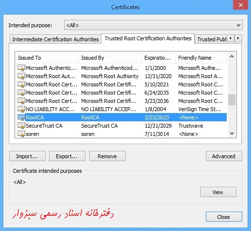 حال اگر دوباره در مروگر به مسیر Tools> Internet Options > Content > Certificates > Trusted Root Certificate Authorities بروید می بینید که گواهی ریشه RootCA به لیست گواهی های ریشه اضافه گردیده است.