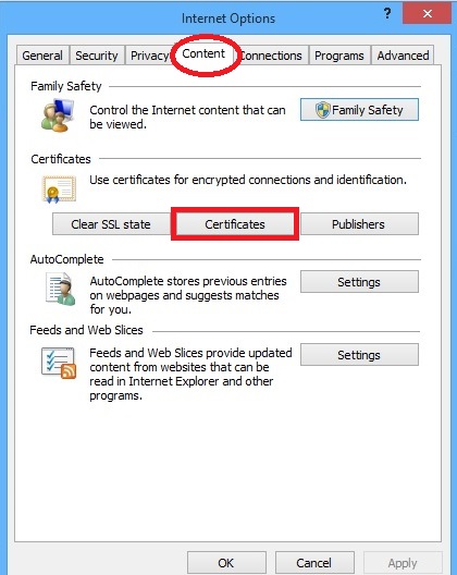 حال در کادر باز شده روی تب Content  کلیک نمایید و سپس روی گزینه Certificates کلیک نمایید